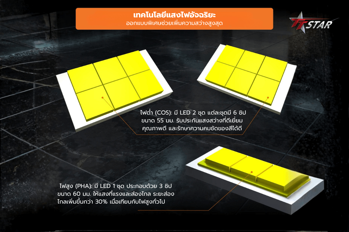 การจัดเรียงชิป LED ที่ออกแบบมาเพื่อการส่องสว่างทั้งไฟต่ำและไฟสูงโดยเฉพาะ |