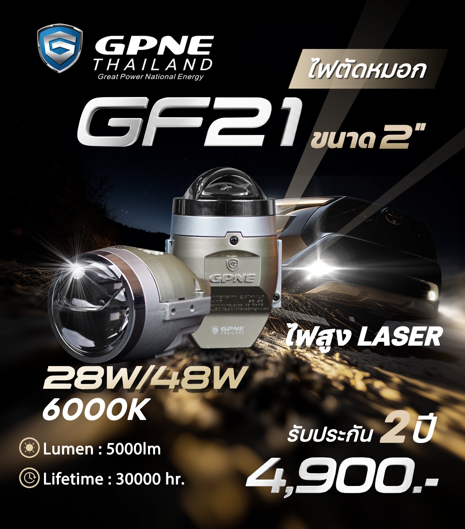 GPNE GF21 | ไฟตัดหมอกโปรเจคเตอร์ BI-LED 28-48W ไฟสูงเลเซอร์ แสงขาว 6000K รับประกัน 2 ปี